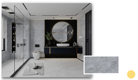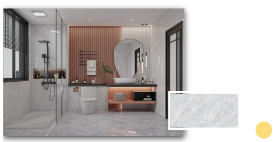 安道爾橙格柵背景+水云灰通體瓷拋石中板的溫暖搭配,令一個舒適的浴室環境躍然而上。扇形的鏡面設計配以及暖色調條形燈,不僅契合當下年輕人的空間審美,更煥發出不一樣的青春活力。