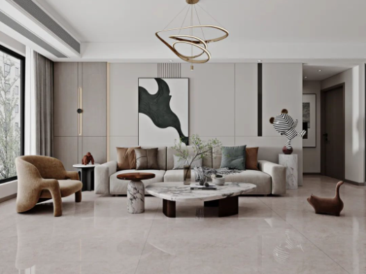 地面的主角哈爾施灰,飄逸的紋理,如無拘無束的靈魂,隨性優雅。深淺不一的自然過渡,配合頗具檔次的不規則燈具、絨布沙發以及大膽有趣的抽象畫,讓空間充滿時尚,不落俗套。