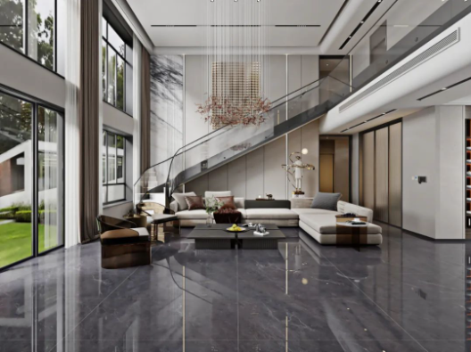 客廳采用挑高設計,不僅能增強室內采光效果,同時突出空間錯落有致的層次感,讓客廳高級感瞬間拉滿,加上斯克深灰獨一無二的紋理,無論檔次、質感、氣場,都透露著別具一格的藝術氛圍。