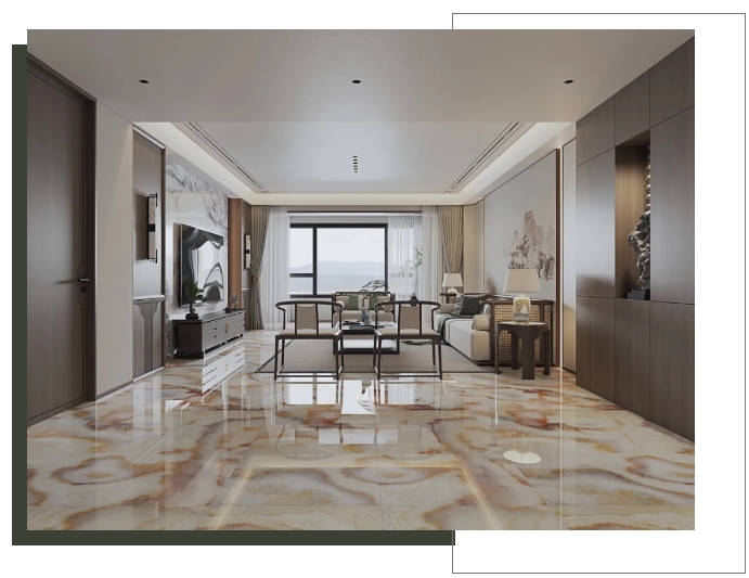【瑪吉特】整體大面積上墻鋪地,打造出大氣磅礴的視覺張力,搭配新中式風格的家居軟裝,將高級與優雅平衡融入,盡顯居者不俗的審美品味。